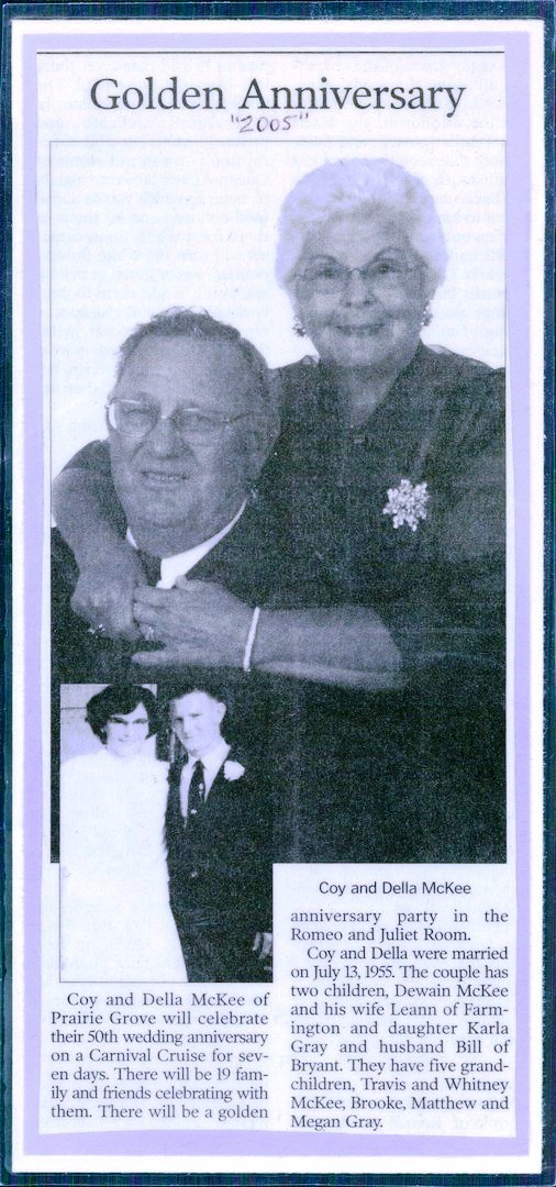 Survivors include his wife of 64 years Della (Smith) McKee; one son Dewain McKee and his wife Leann of Farmington, Arkansas; one daughter Karla Gray and her husband Bill of Bryant, Arkansas; one sister Maralea Eames of Jenks, Oklahoma; five Grandchildren: Travis McKee, Whitney (Marcus) McCash, Brooke (Clint) Bagley, Matthew (Sara) Gray, Megan (Seth) Alkire, and 7 great grandchildren.
