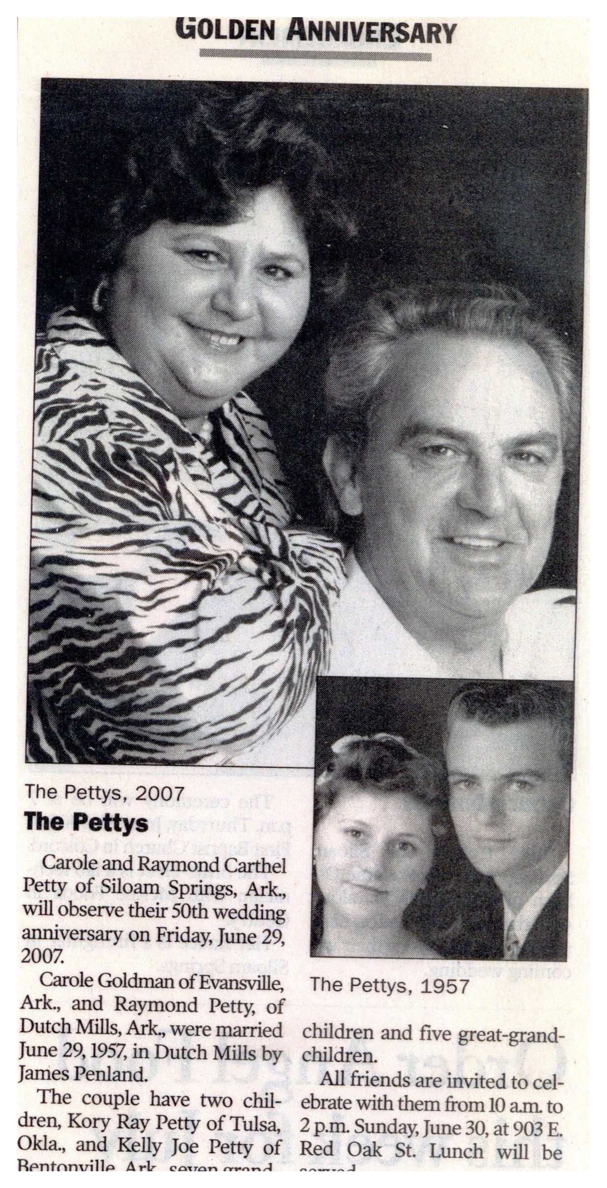 Survivors include his wife of 67 years Carole Rae Goldman Petty; two sons Kory Petty and his wife Tami of Summers, Arkansas, and Kelly Petty and his wife Ida Mae of Siloam Springs, Arkansas; one sister Velma Pershall of Prairie Grove, Arkansas; seven grandchildren Sonia Taylor and her husband Jason, Tanya Petty, Tara House and her husband Chris, Nick Petty and his wife Stephanie, Mark Petty and his wife Melissa, Dustin Youngblood and his wife Tara, and Ryan Younblood and his wife Lauren; sixteen great grandchildren Colton, Callie, Blake, Carmen, Kynslee, Kendalyn, Noah, Caleb, Amelia, Landon, Elissa, Laney, Lyra, Atlus, Jack, and Luke and three great-great grandchildren Kennedy, Delaney, and Mallory; several nieces and nephews.