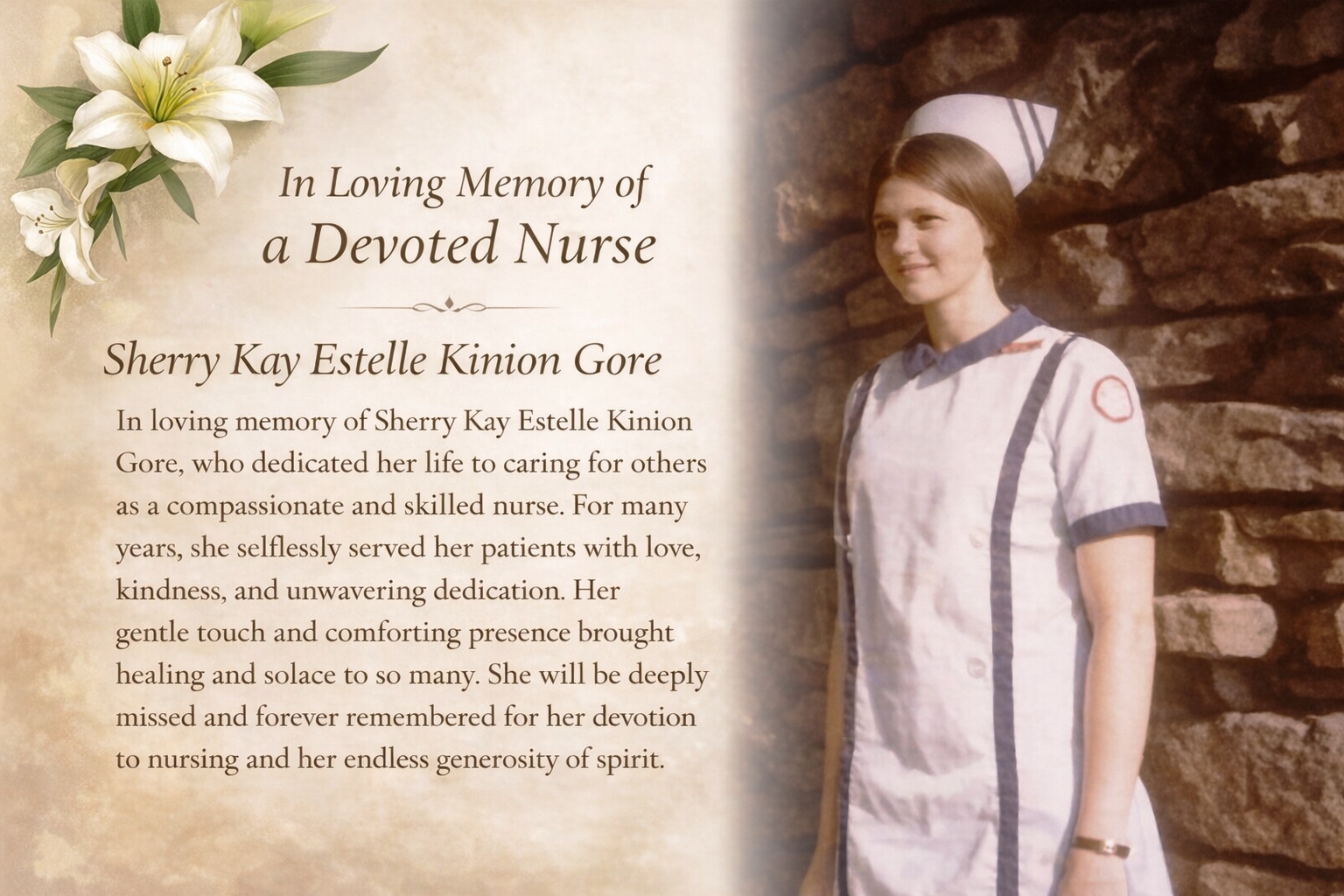 Sherry grew up in Northwest Arkansas and was a graduate of Prairie Grove High School. A beautiful lady inside and out. Sherry dedicated her life to serving and caring for others. After high school, she earned her degree in nursing from the University of Arkansas Nursing Program. Nursing was her passion, and she was beloved by her patients, especially those she cared for in the Branson, Missouri, area where she worked for the Skaggs Healthcare System for 27 years.